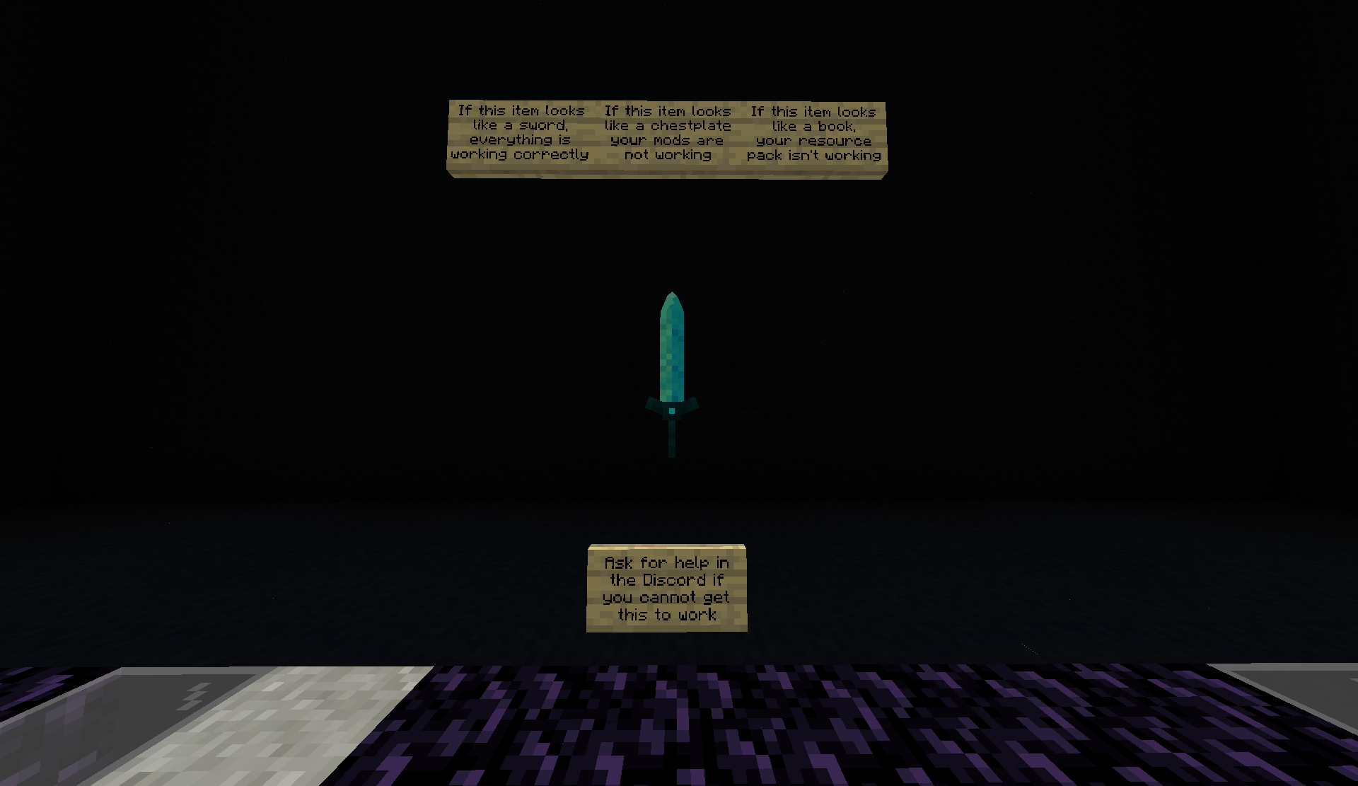 At the end of this wing is an armor stand which holds an item, used to test if your visuals are working properly. If the item looks like a blue sword, as in the above photo, everything is working correctly.