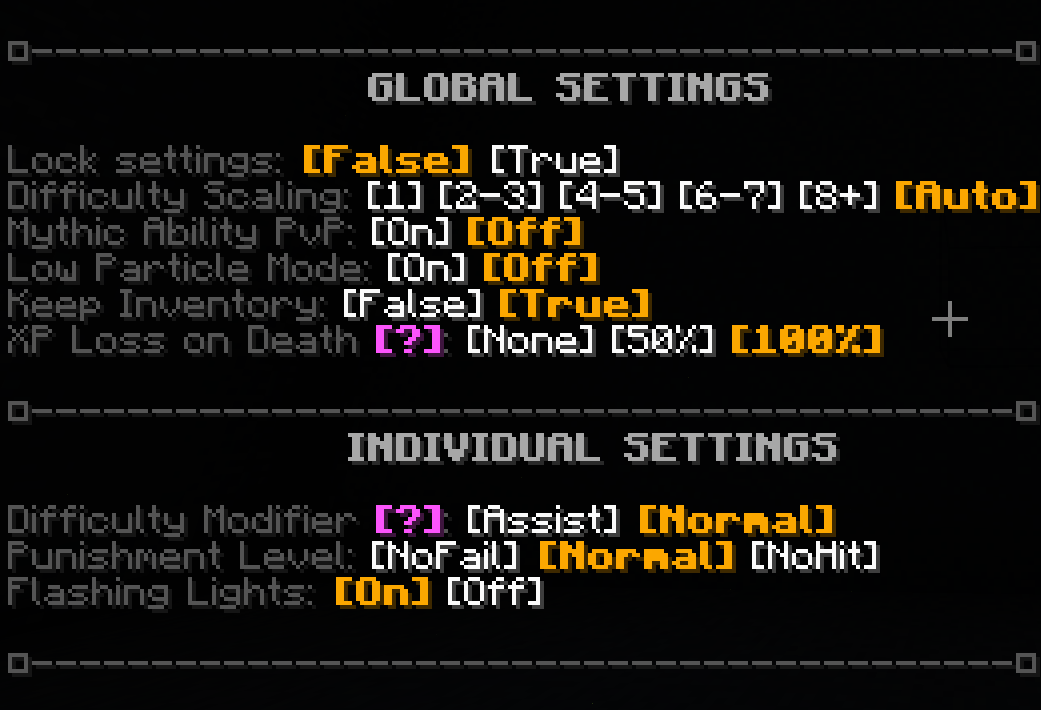 Lock Settings: [False] [True] - When set to [True], locks the current settings for all players. Available to world host on multiplayer servers.