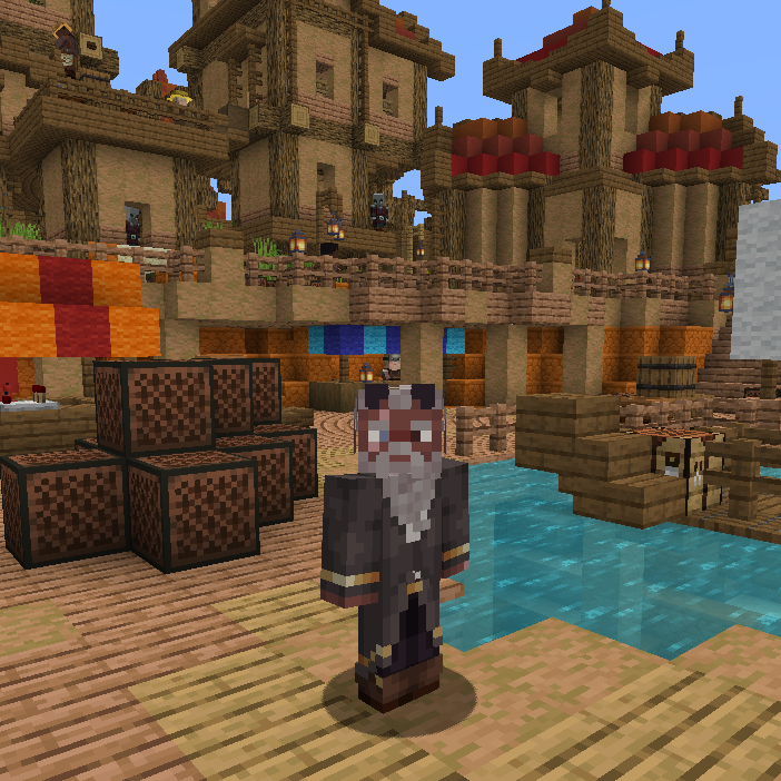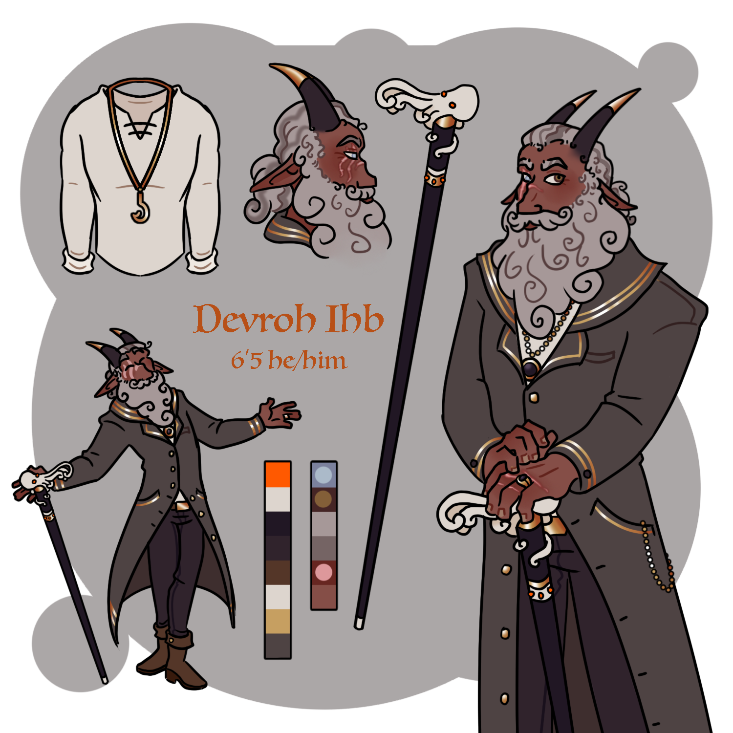 Captain Ihb towers over most people at 6'5" (~196 cm). He has dark skin and white hair, with a large, bushy beard. His horns are straight and black, with gold tips. He carries a staff with an octopus ornament.