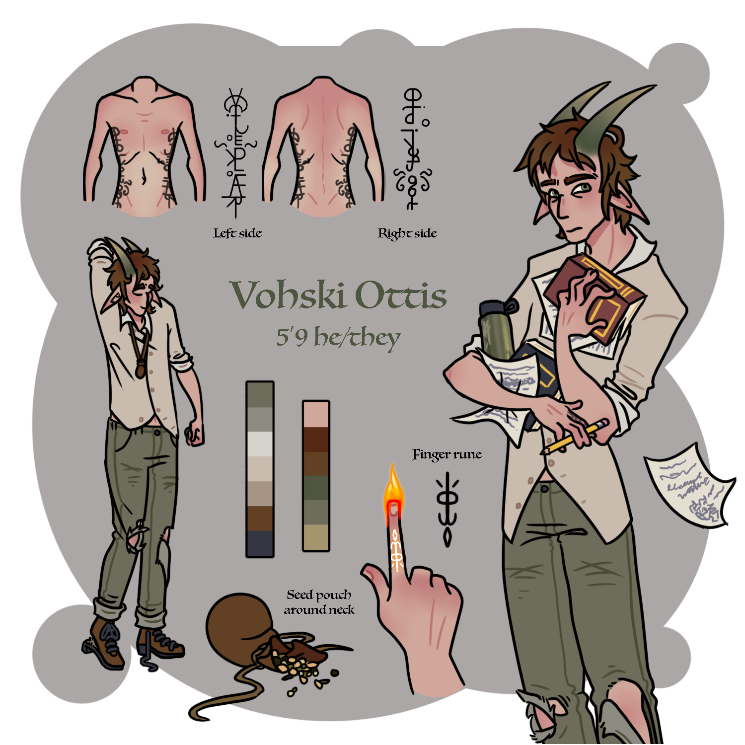 Vohski stands at 5'9" (~175 cm). He is thin, with pale skin and messy brown hair. His horns are straight and green.