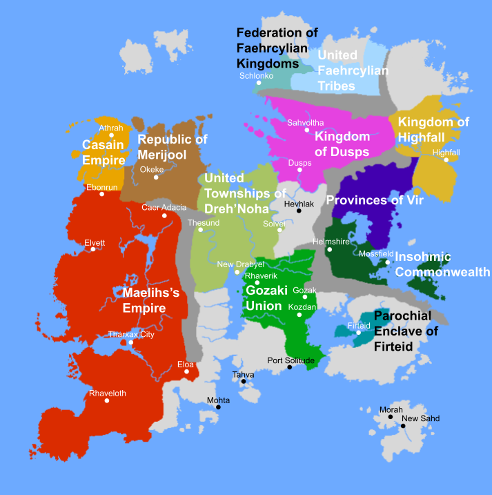In the late Third Avihm, Insohm and its member states encompassed nearly the entire continent, even including lands in the Black Jungle that Avsohm never possessed. However, Insohm never did truly exert absolute authority over these other states. In the above map, all labeled political bodies except for Mael's Empire were allied with Insohm.