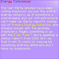 The last thirty minutes have seen rolling blackouts across the entire energy network, as if something is overdrawing and our infrastructure can’t keep up. Early reports coming out of Primary Energy Collection are showing issues with the anomaly stabilizers. Maybe something is up with the Ever-Fear? We’re awaiting a status report from C.O.O. Orix on that front. It could of course be something entirely different, but I have my suspicions.