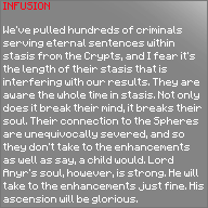We’ve pulled hundreds of criminals serving eternal sentences within stasis from the Crypts, and I fear it’s the length of their stasis that is interfering with our results. They are aware the whole time in stasis. Not only does it break their mind, it breaks their soul. Their connection to the Spheres are unequivocally severed, and so they don’t take to the enchantments as well as say, a child would. Lord Anyr’s soul, however, is strong. He will take to the enchantments just fine. His ascension will be glorious.