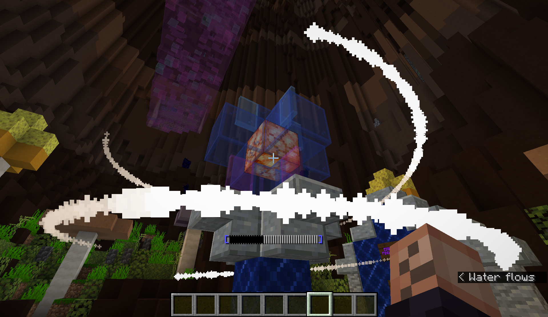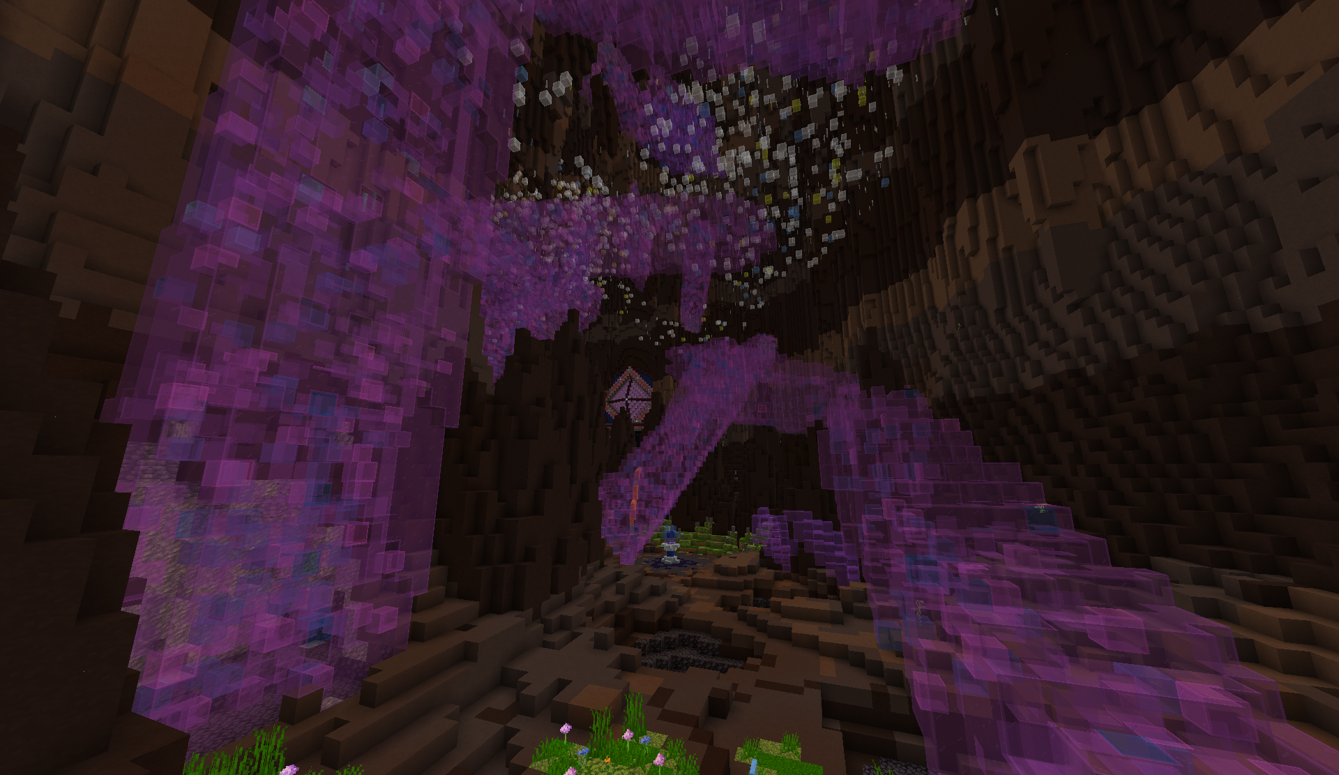 The actual structure can only be accessed in one way. From the summit of Aldregakar, a river flows into a large circular hole, forming a waterfall and depositing into a lake. Behind this waterfall is a cave, which leads deep into the mountain. As the tunnel gets very narrow, a small opening can be climbed through to the right. Follow this path up and to the right, until it turns from terracotta to dripstone blocks. Turn left at the dripstone blocks, and you will emerge at the start of the Augural Tangle.