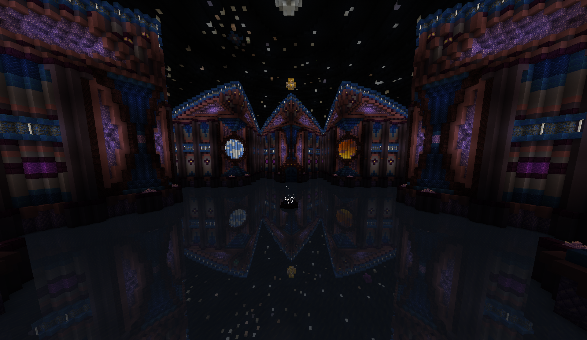 Just southeast of the center, a blue and purple ring structure, with an outer ring of lapis lazuli blocks, is visible on the ceiling but missing in the reflection. Coordinates: (1143, 1024)