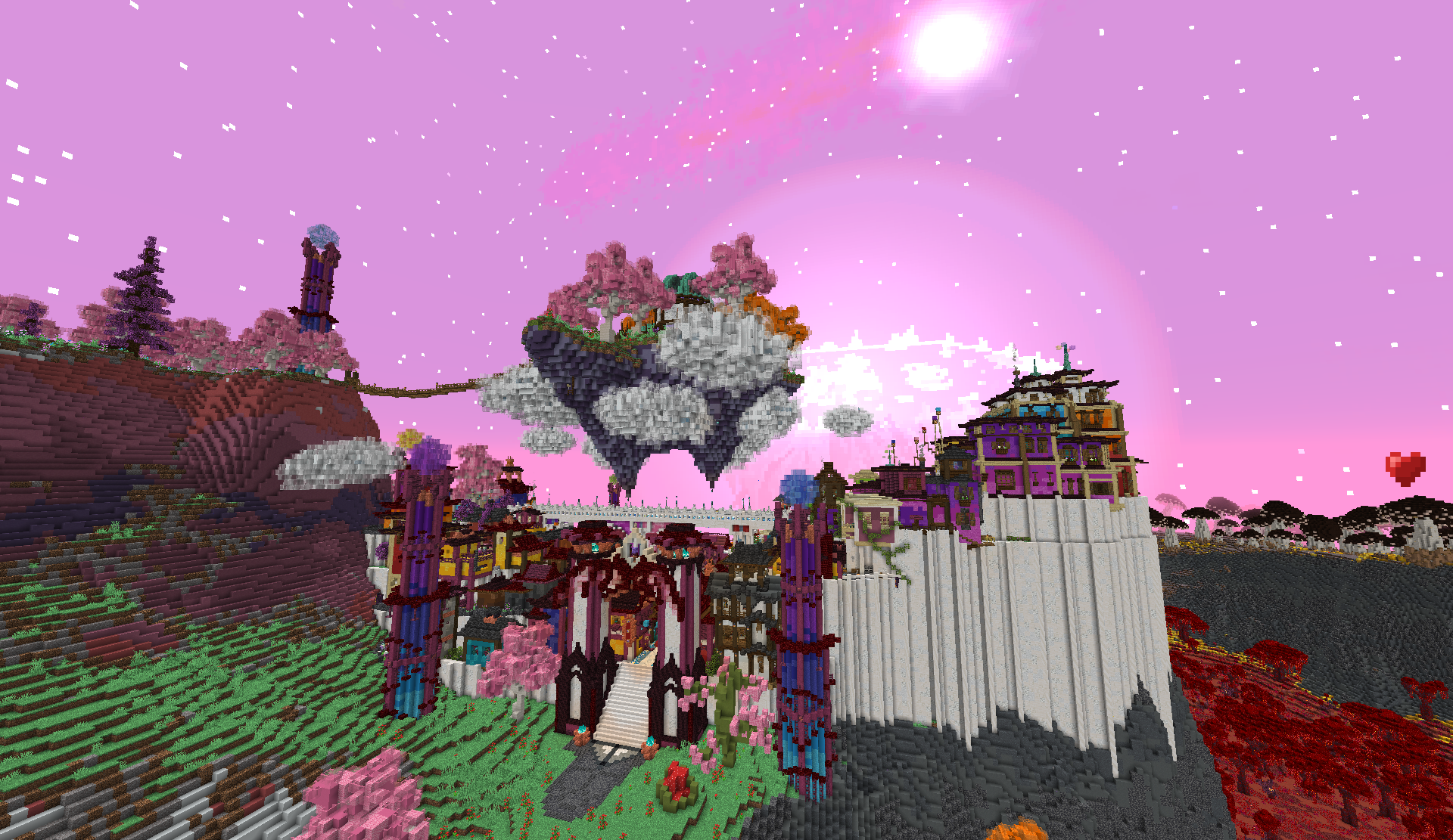 Naharja is an extremely vibrant and colorful city populated entirely by Tehrmari, the race of dragon-like people found throughout Lo'Dahr and in the Purity Peaks region of Drehmal. The city sits upon a hill, with two large staircases leading up from the surrounding area in the north and south, respectively. Buildings are often built with one specific solid color, similar to the buildings in Dusps, but with more variety in the pallette of blocks used. Crimson wood is heavily utilized as an accent, and the city is paved with white quartz/calcite roads.