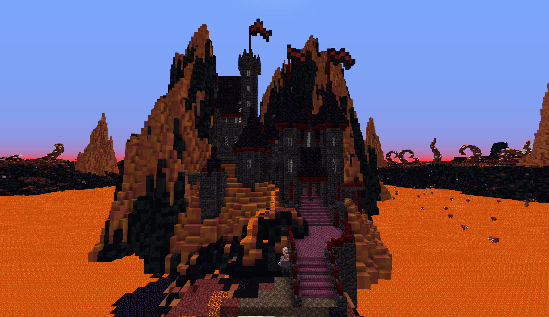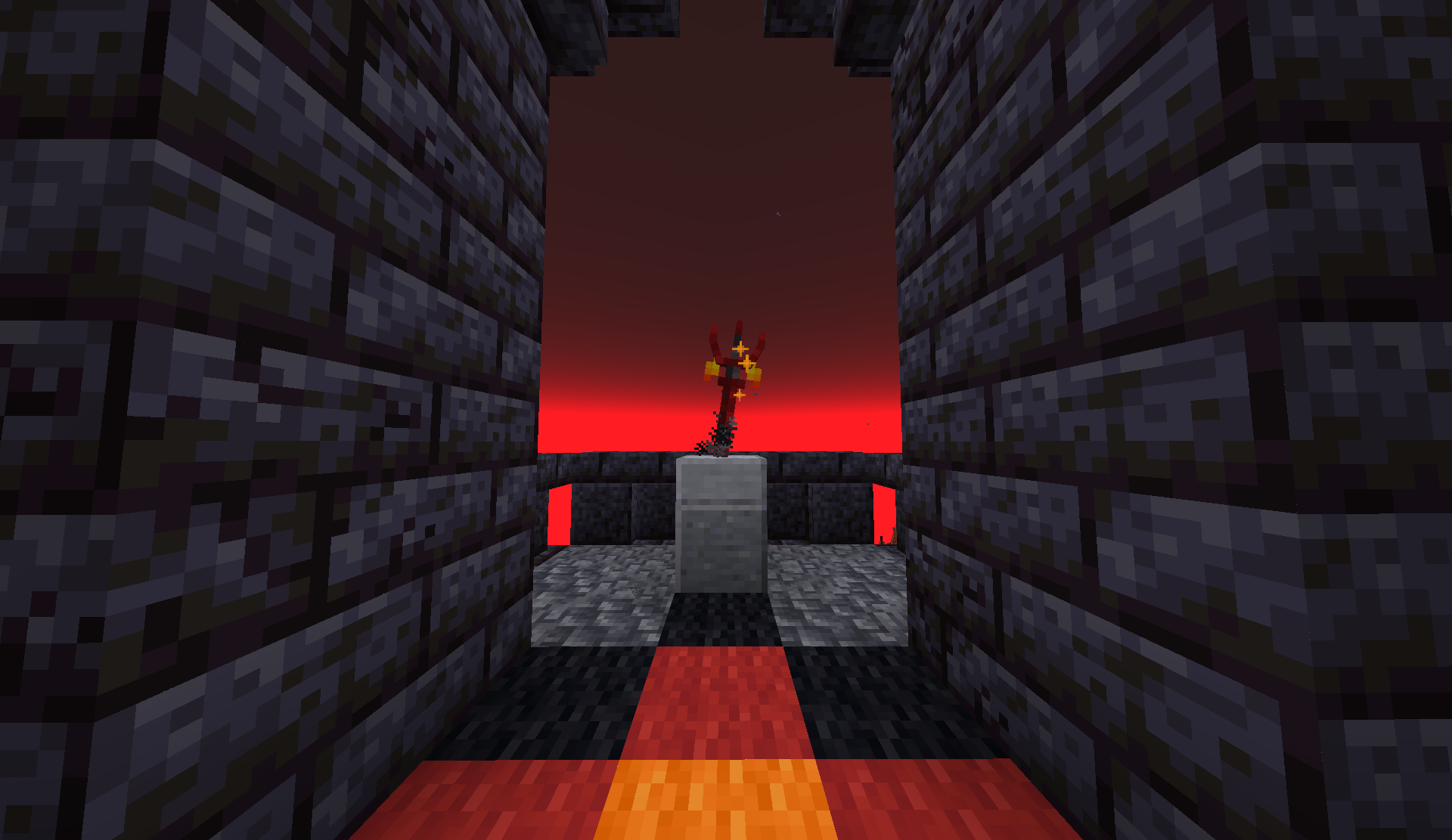 The main door to the palace opens to reveal a grand, but empty hall, with a massive throne at the back of the room. The floor is made of obsidian, with orange stained glass cracks covering lava.