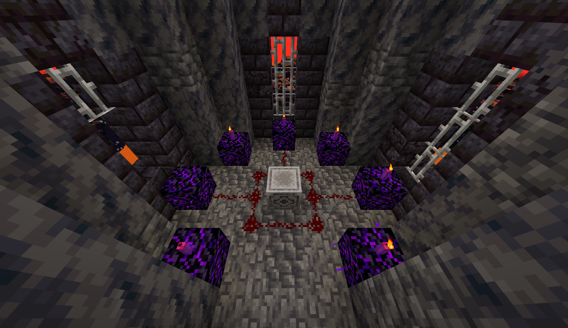 A purple candle must be placed on the empty silent obsidian block, and then lit. Doing so will trigger an animation, and the template will appear at the center in a flash of lightning. The candle can be placed on anything, as long as it is in that exact location and lit.