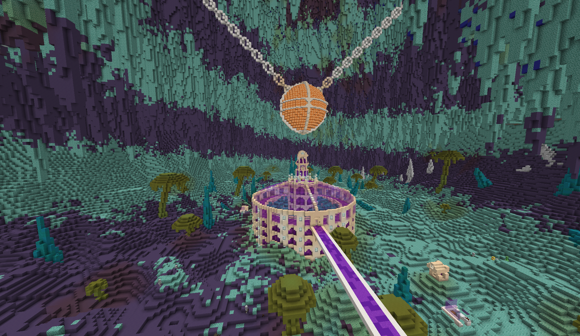 Following this cave leads to a drop, then another tunnel which opens into a massive cavern, whose walls are lined with blue terracotta and prismarine. Strange green terracotta mushrooms, filled with glowstone, grow out of the cave's floor. A traditional High Avsohmic purple/quartz dome sits in the center of the cave, beneath a gigantic orb with an unclear use.