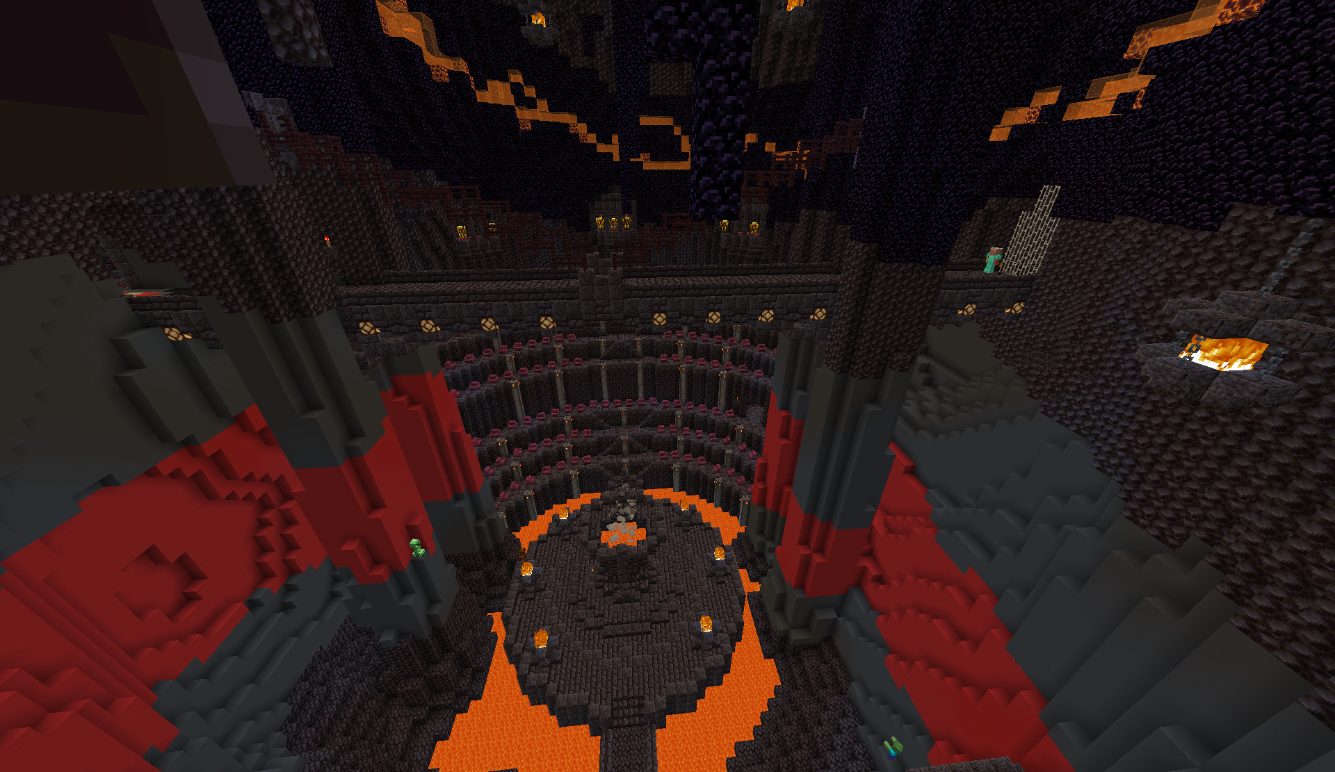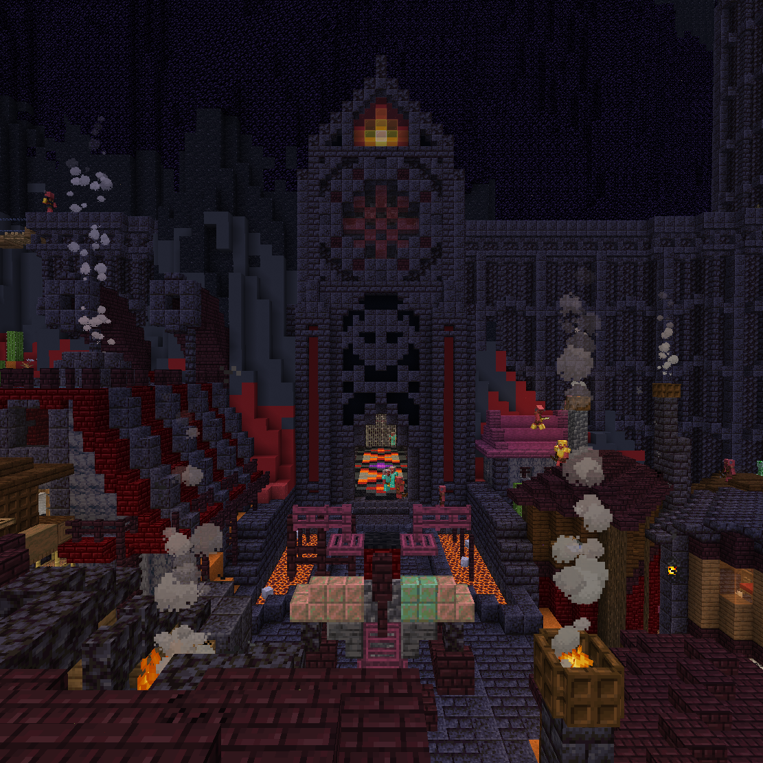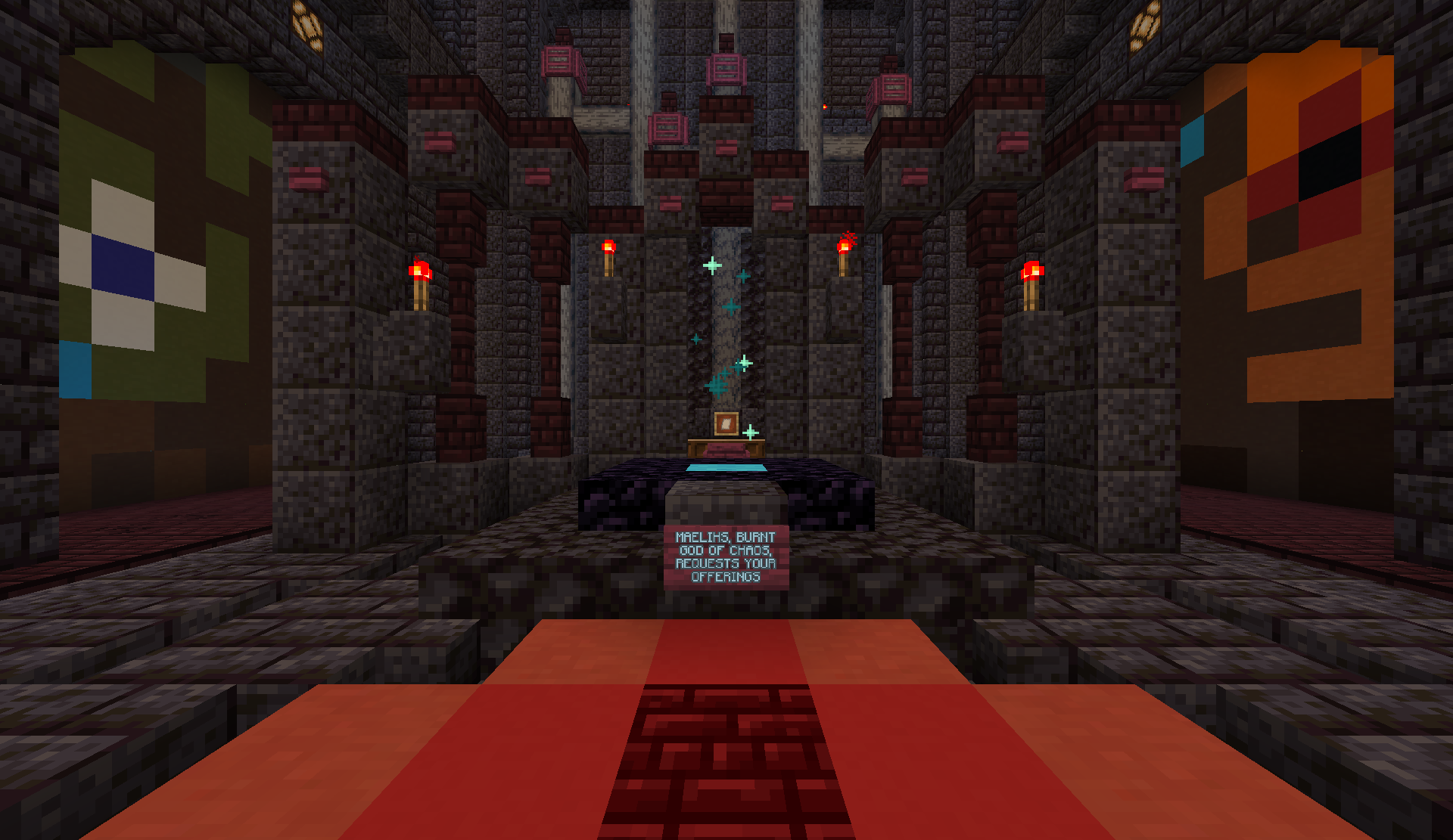 The Sepulchral Altar is a small dungeon, filled with relatively dangerous enemies. Maelmari Brutes outfitted with axes and diamond armor, named "Burnt Templars", can be found throughout the dungeon, including in its large entryway. These mobs deal significant damage, but are relatively slow. Being piglin brutes, they will aggro on players even if they are wearing gold armor. Players must break through one of two large doors (made out of iron bars) in order to progress.