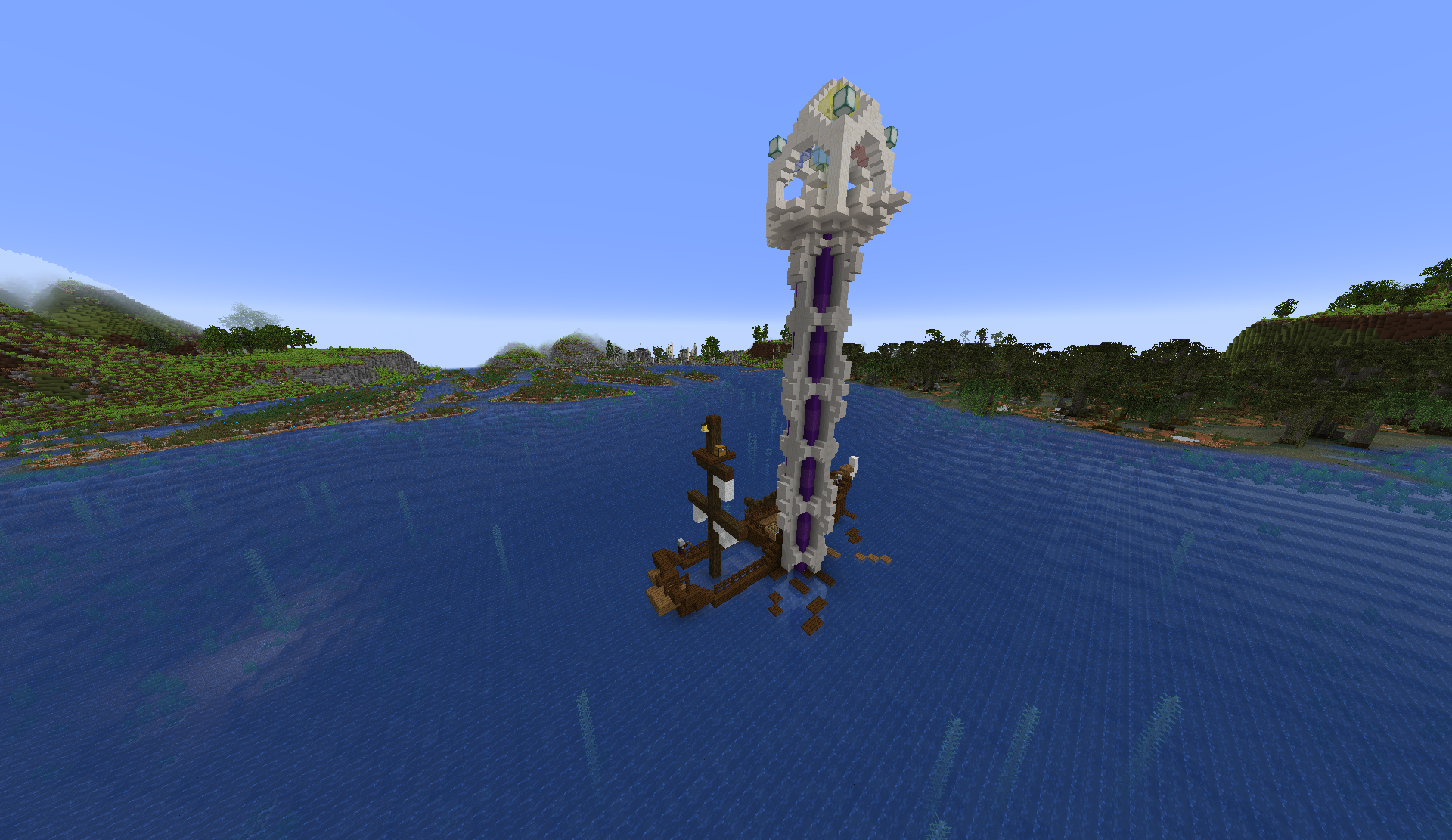 The Gulf of Drehmal's Terminus tower sits half-submerged in the middle of the coast's central inlet. A sinking boat full of Mihkmari that had crashed into the tower floats adjacent to it.