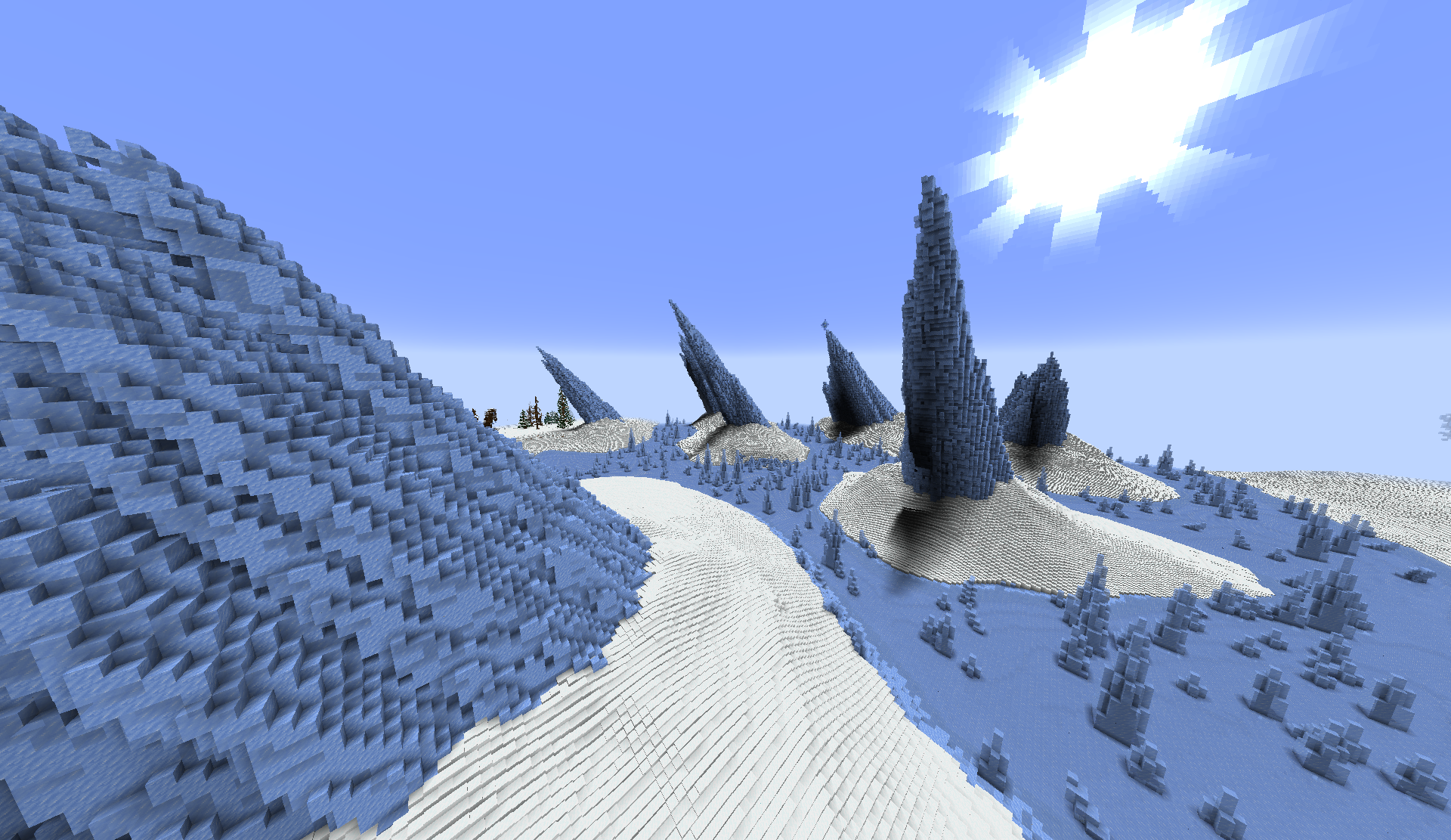 • Area with frozen rivers and lakes and massive, slanted ice spikes in east