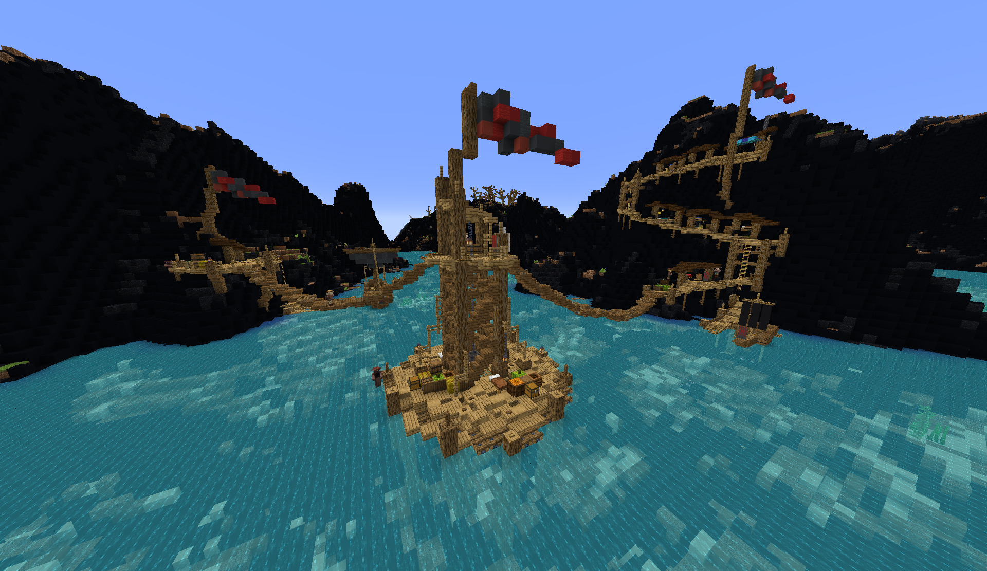 Tahva is constructed between two islands, with a series of simple wooden ramps and bridges connecting the pieces of the small settlement, including a floating platform in the center. Three flags of gray and red fly in the settlement, likely depicting the town's custom banner.